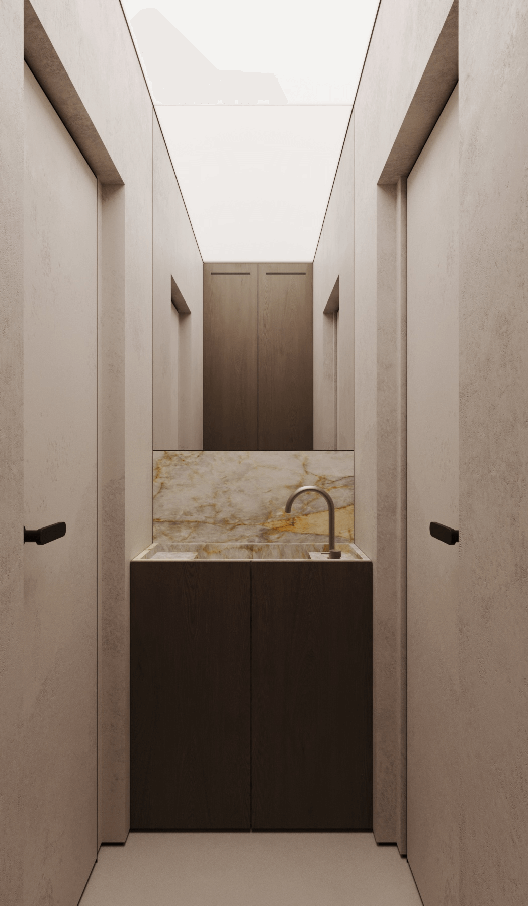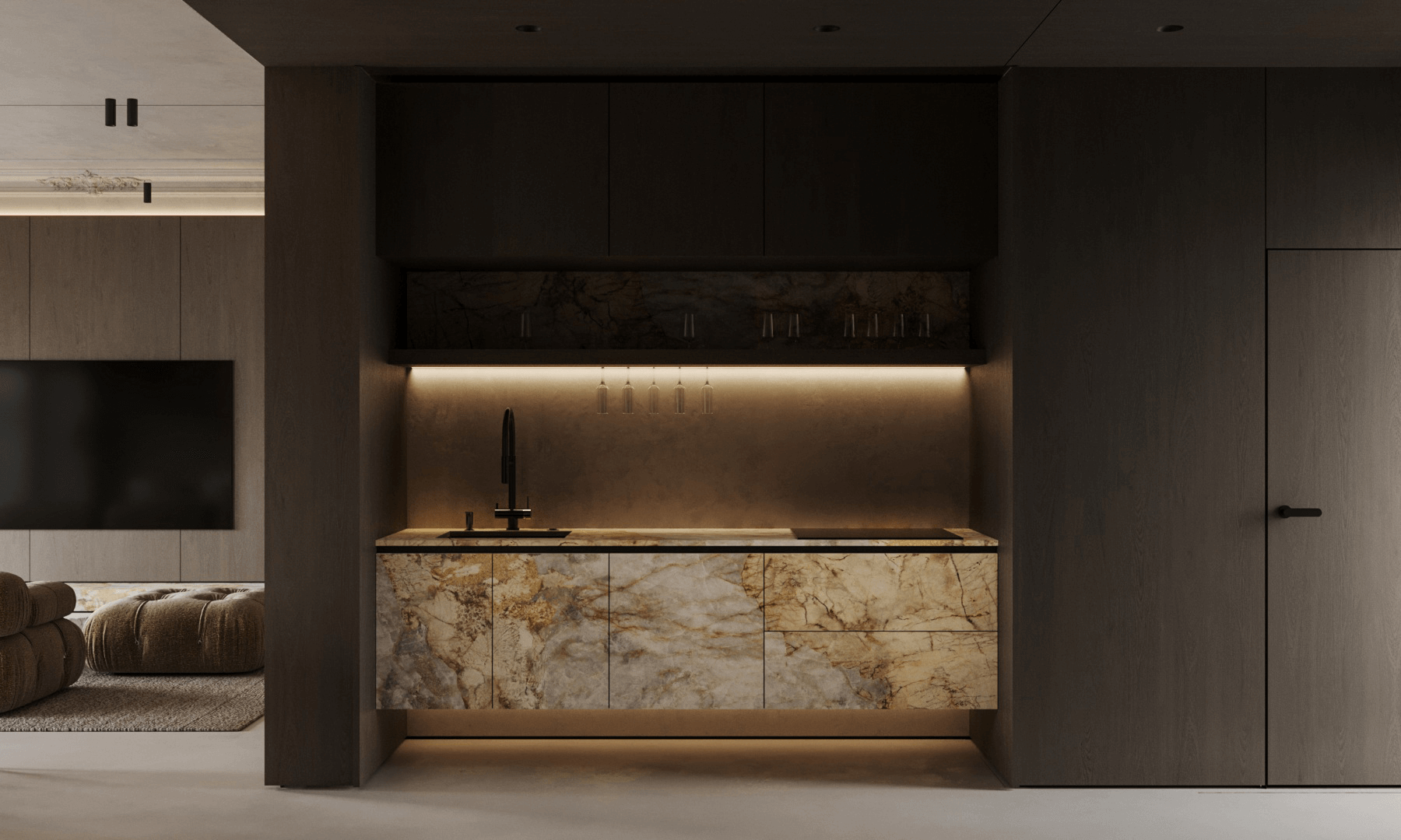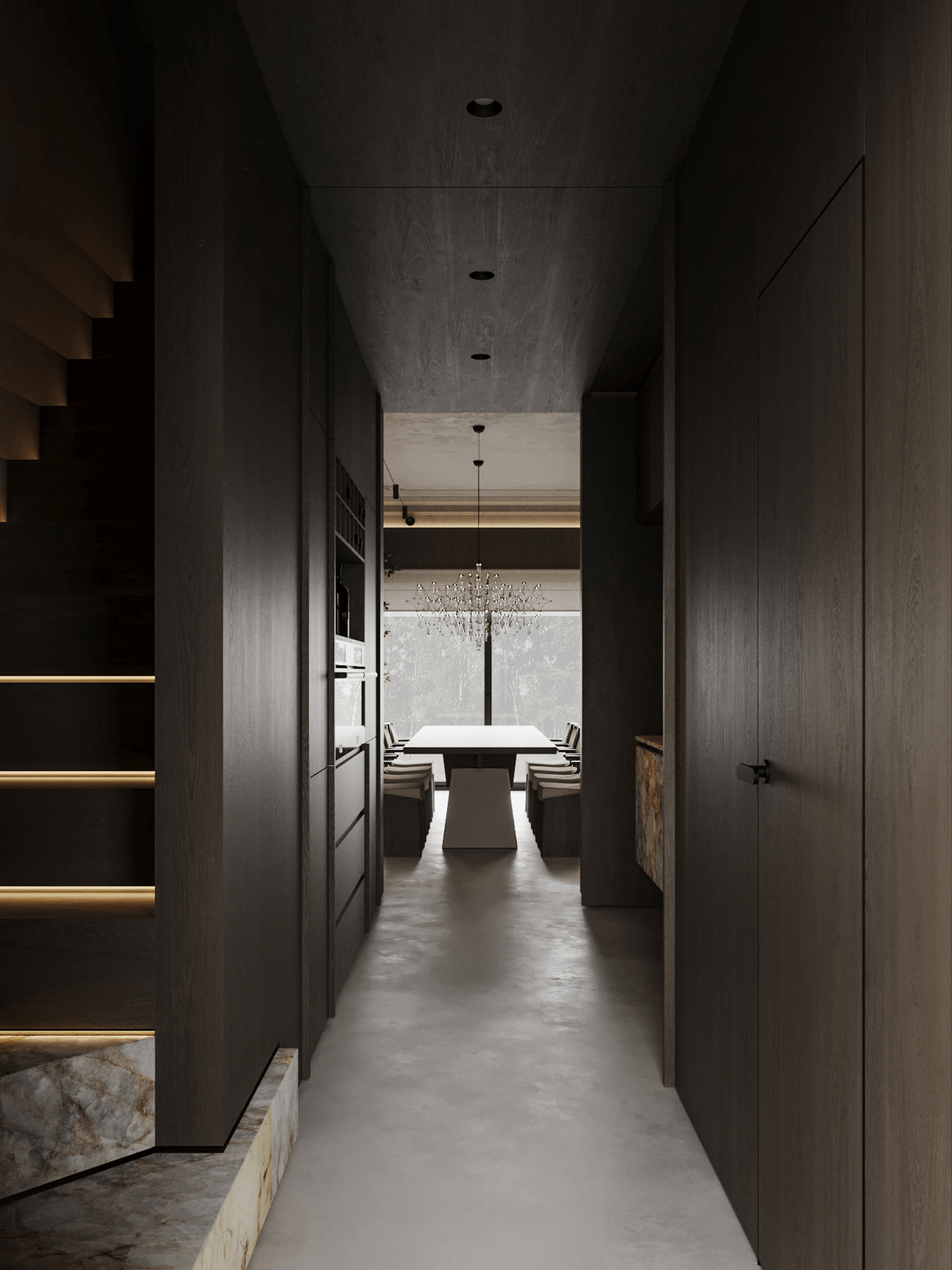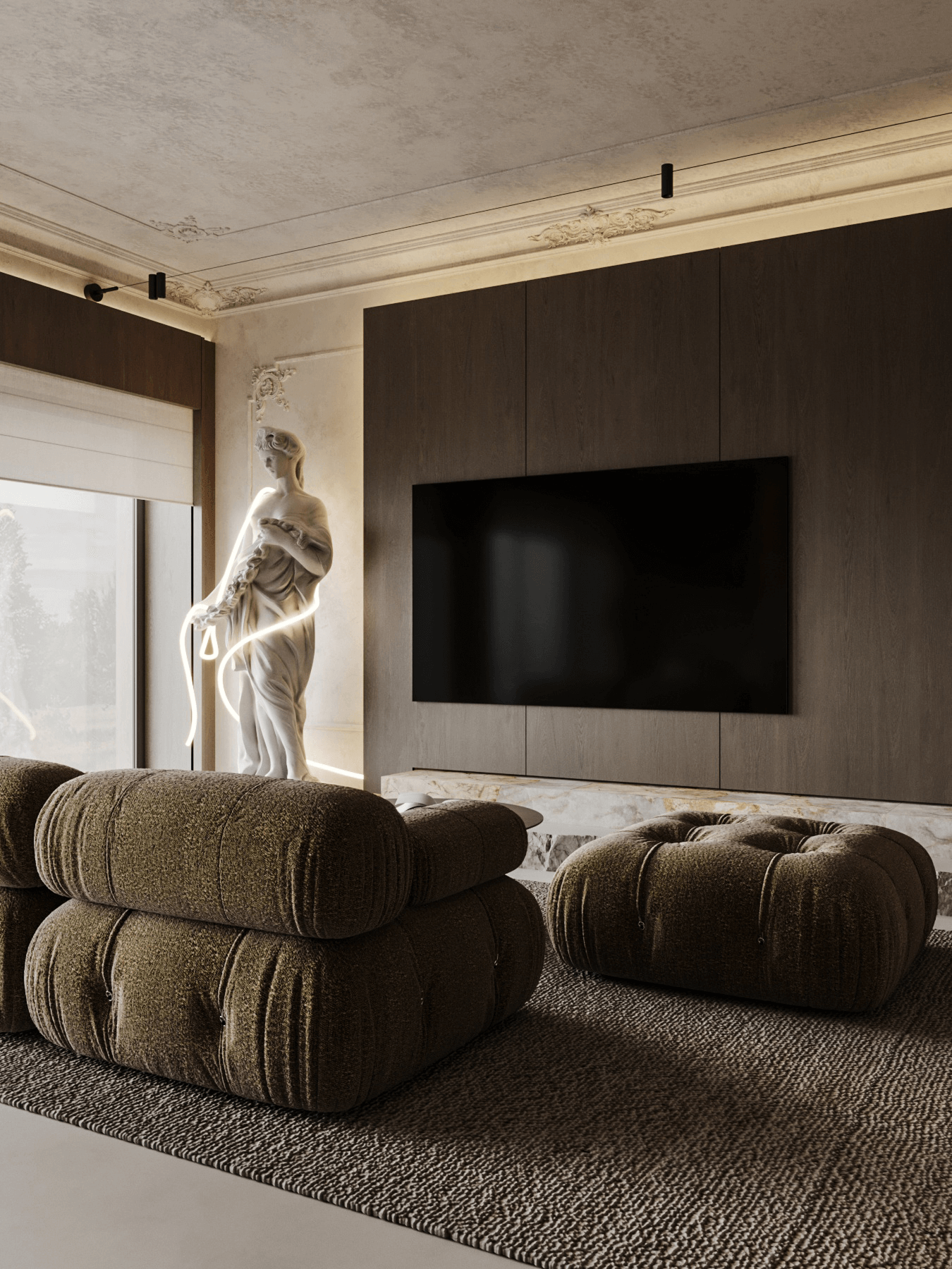 Фактурные стены из микроцемента, панели, статуя, декоративная скала — всё находится в разрезе между классикой и современностью.