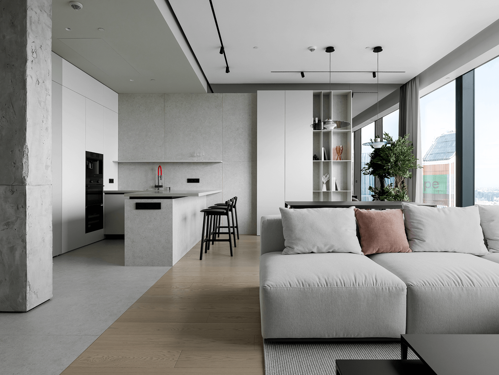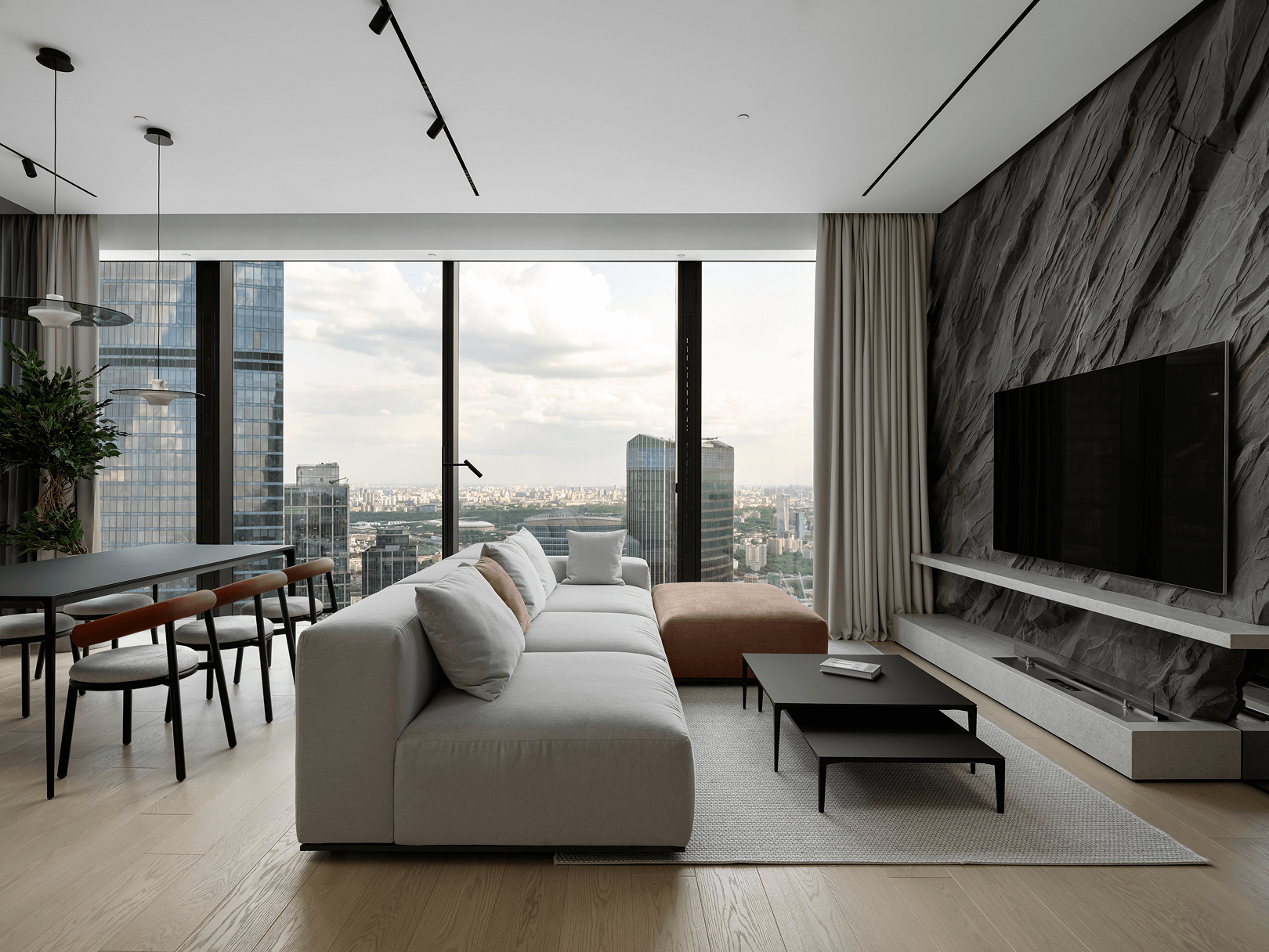 Когда заказчик обратился к нам за дизайн-проектом, мы, имея опыт с помещениями в Москва-сити, сразу поняли, что интерьер должен быть наполнен духом мегаполиса.