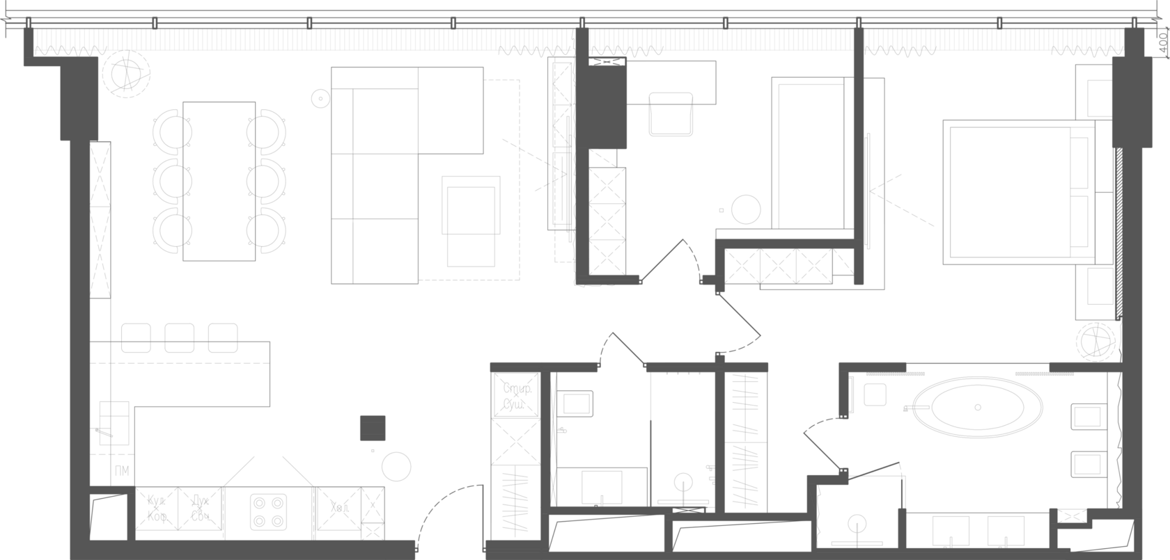 -гостиную-столовую-кухню (ей отведено более половины всей площади)